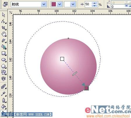 1、新建一个文件,选择椭圆工具,按住Ctrl键画出一个正圆。然后选择交互式填充工具,在椭圆上拉出一个从白到紫的射线渐变,这里紫色值为C: 20 M: 80 Y: 0 K: 20。完成一颗珍珠。