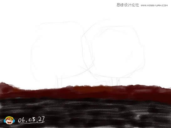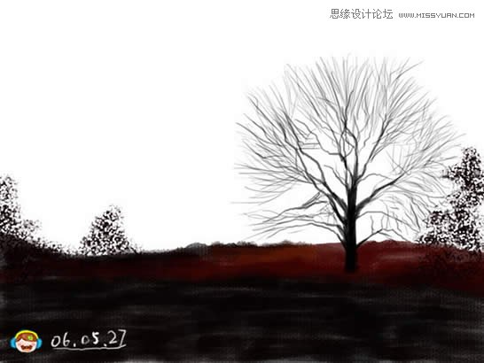 4、画出画面中的树,在顶部建立新层,使用圆头柔边画笔,画的时候随时更改其大小,使用钢笔压力。 |