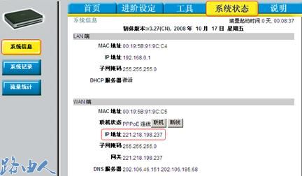 二、点击系统状态,在下面的WAN端查看到相应的IP地址