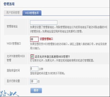 二、把系统工具—管理选项—WEB管理选项中是否允许外部主机使用WEB管理勾选并保存,并设置具体的管理端口,设置管理端口为88。