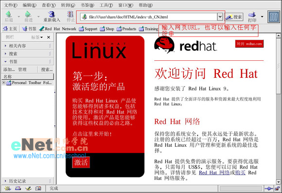 单击面板上的“Mozilla网页浏览器”按钮,就可以启动Mozilla网页浏览器了。在浏览器上方的“书签”中可以执行“书签/加入书签”命令来保存网页地址,在浏览器的地址栏中可以输入网页的URL,也可以输入任何字符串,Mozilla会自动搜索相关的资料。