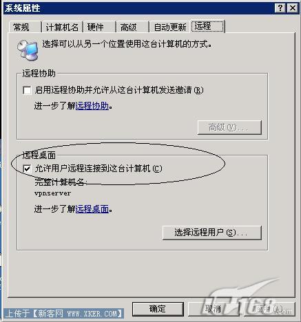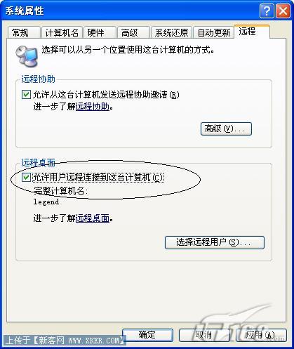 第三步:在远程标签中找到“远程桌面”,在“容许用户连接到这台计算机”前打上对勾后确定即可完成XP下远程桌面连接功能的启用。(如图2)
