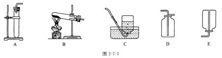 ②收集装置选择依据:根据生成气体的性质,如水溶性、密度等。收集的方法具体分为三种:排水法:适合收集难溶于水或不易溶于水且不与水发生反应的气体。如图2-7-1C;向上排空气法;适合收集密度比空气大且不与空气中的物质发生反应的气体。如图2-7-1D;向下排空气法;适合收集密度比空气小且不与空气中的物质发生反应的气体。如图2-7-1E。