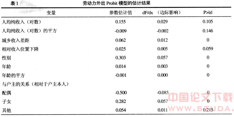最后,外出经验应该显著地有助于家庭成员做出当年是否外出的决策,遗憾的是,在目前的住户调查中没有足够的外出经验方面的数据可用。