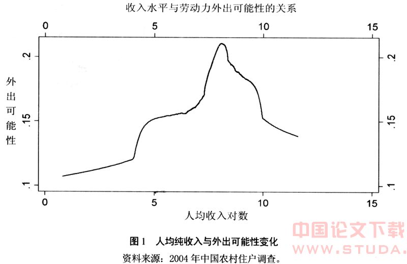 (1)家庭人均纯收入越高,农户外出的可能性越高,但随着收入水平的提高,外出可能性的提高速度放陵。这与其他实证分析的结果相一致。外出务工需要支付成本及承担风险,因此通常要有一定的收入基础作为保障,但是,当农产收入达到一定水平后,外出务工的动力就会减弱。图1给出了不同收入水平下农村劳动力外出的可能性,其分布遵循倒U形状,最富和最穷的家庭劳动力外出的可能性是最小的。
