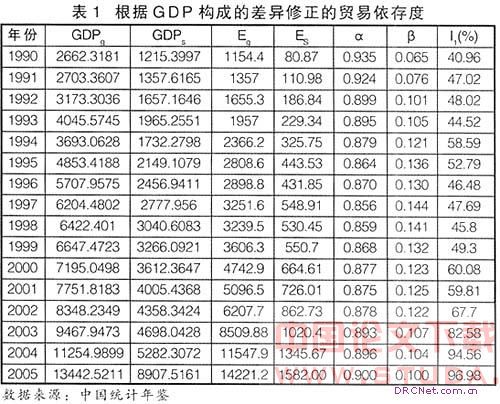 20世纪90年代以来,加工贸易额已经超过出口总额的50%,已经成为我国第一大贸易方式。加工贸易与一般贸易有许多不同之处,一般贸易的生产和加工要在国内完成,出口附加值可达60%以上;而加工贸易主要是来料、来样加工,从国外进口设备和原材料等投入品,产品直接出口国际市场,只有有限的生产加工程度在国内完成,且技术含量低。尽管近年来加工贸易的国内采购率和增值率有所上升,但与国内经济运行的联系不很密切。因此运用包含大量加工贸易在内的外贸依存度指标,会在相当程度上夸大我国经济对国际市场的依赖程度。加工贸易对GDP产生影响的只是进出口差额部分,所以为了反映加工贸易对我国国民经济的实际影响,在计算依存度时,应扣除加工贸易额,只计算其净出口额。而这些只影响商品贸易额,修正的商品贸易额计算公式为: