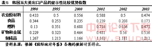表5显示,韩国的五大类出口产品中,农业原材料、燃料、矿物和金属的RCA值在整个考察期间内均呈现上升态势,而食品和制成品的RCA 值在整个考察期间内均呈现下降态势。从韩国各类产品的RCA数值来看,只有制成品的RCA值在整个考察期间内均大于1,表明制成品始终具有比较优势;而其他4类产品的RCA值在整个考察期间内均小于1,表明这4类产品始终具有比较劣势,其中,食品的比较劣势最明显。