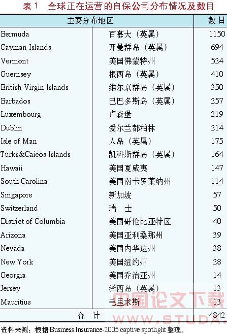 全球第一家自保公司——凤凰保险公司②成立于18世纪中叶。20世纪20年代,一些大的跨国企业开始成立自保公司,到2004年,全球自保公司数量已经达到4800余家,保费规模达到560亿美元。自保公司行业已经成为一个非常成熟的行业领域,其主要分布情况见表1。