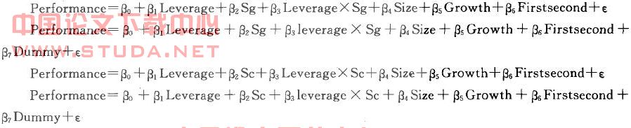其中各变量符号的名称及其定义解释如下:资本结构(Leverage):总负债/总资产;公司业绩(Performance):每股收益(Eps);资源丰度(Sg):将行业销售收入与时间哑变量进行回归,再用回归系数除以行业收入的均值来加以计量。复杂性(Sc):先对行业中每一个企业所占的市场份额(单个企业的销售收入占整个行业的销售收入)加以平方,然后再将各项平方值加总。公司规模(Size):总资产的自然对数;公司成长性(Growth):净利润增长率;第一大股东控制权(Firstsecond):第一大股东持股比例/第二大股东持股比例;环境变化分组(Dummy):当公司所处行业变化稳定时,该虚拟变量取1,否则取0。
