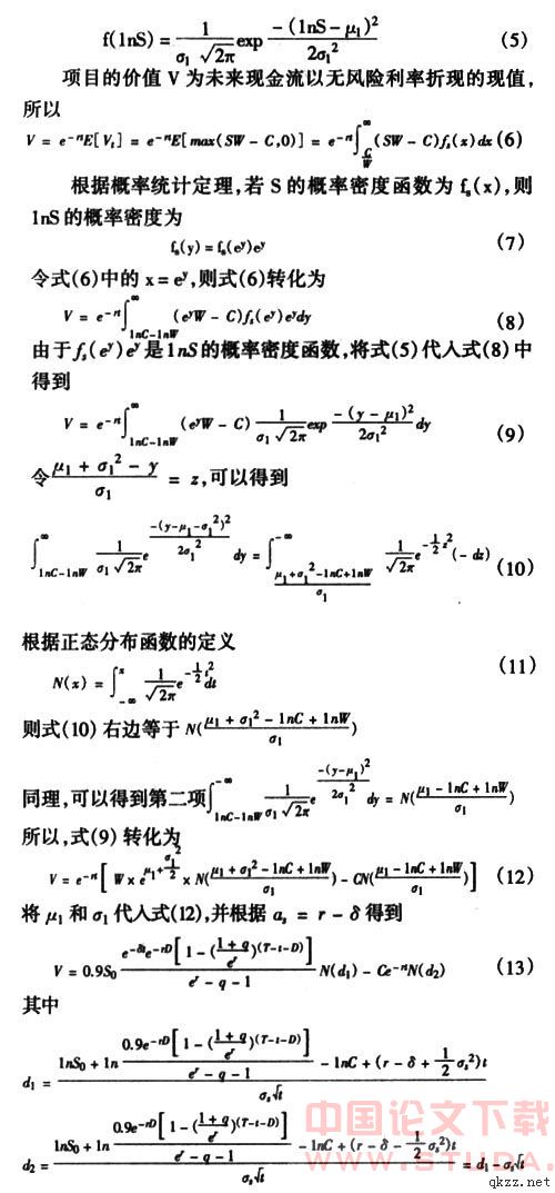 分析时,金融领域的一项重大研究成果——以Black和Scholes的经典论文为标志的期权定价理论启迪了项目投资决策新方法,他们通过构造期权的动态复制组合来对冲期权风险,并获得无风险收益,在无套利机会和无交易费用等假设下,经过严密的数学推导,得出了基于不付红利股票的任何期权价格必须满足的微分方程,并运用该方程,推导出股票的欧式看涨期权定价公式,即著名的Black-Scholes模型。同时,Cos、Ross和Rubinstein提出了标准的二叉树定价模型,使离散时间的期权定价问题得以简化,进一步发展和完善了期权定价理论。最先把期权定价理论引入项目投资领域的是Stewart Myers教授,他于1977年首次提出金融期权思想及其定价理论与方法可用于项目投资的评估与决策,并称之为实物期权。